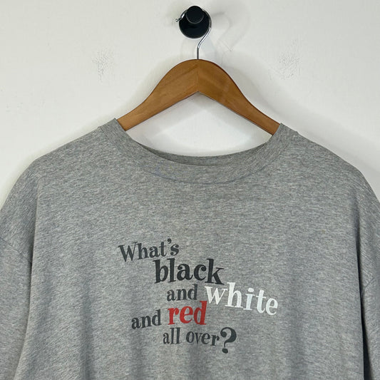 WHATS BLACK WHITE AND RED ALL OVER? TEE